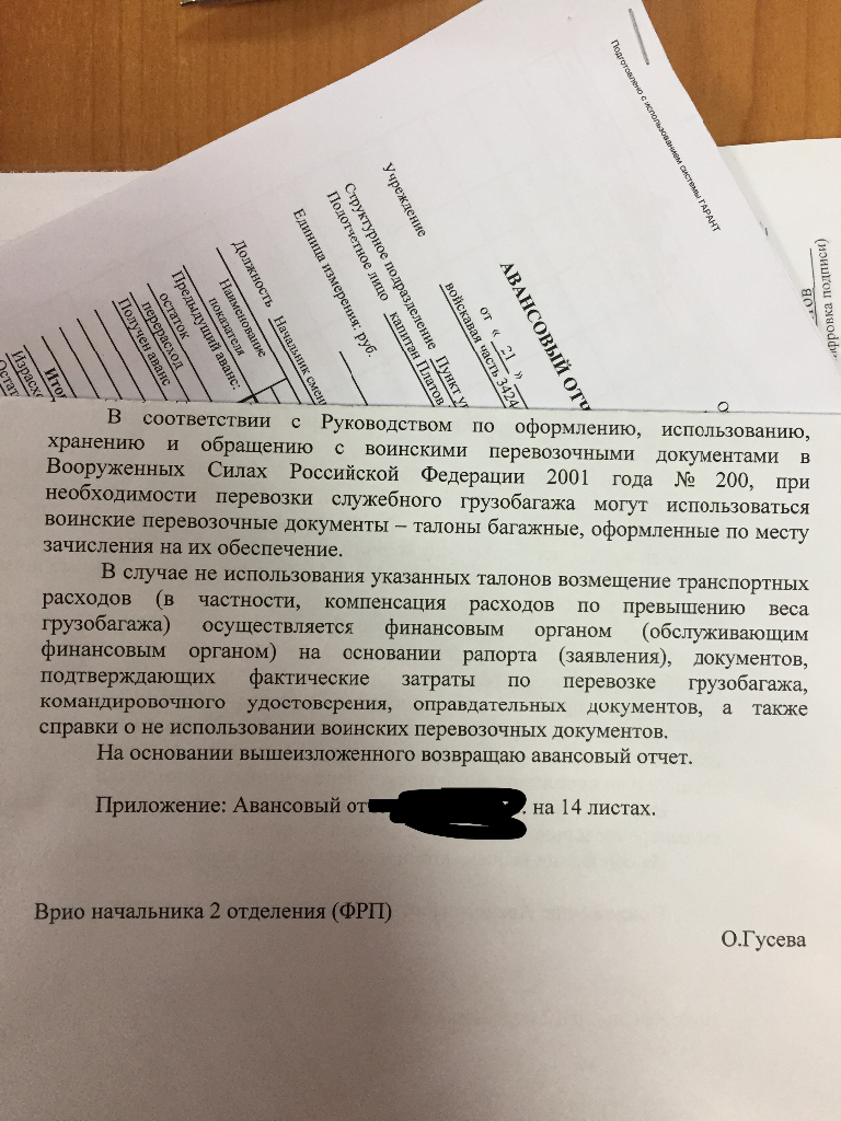 Докладываю Вам о том, что ---------2017 г. я гв. ------------ ознакомлен с приказами командира в/ч № от ---------------- . и № от --------------- « Об убытии л/с в/ч в служебную командировку на полигон «----------------------------------» в связи с чем, каких либо полагающихся денежных средств и продовольствия с --------------------- по настоящее время мне не выдавалось и не выдано. В результате чего названные приказы в части касающиеся убытия в служебную командировку гвардии ------------ по внезапно возникшим, непреодолимым обстоятельствам разрешение которых не требует отлагательств и напрямую зависящих от финансовой и продовольственной необеспеченности связанных с убытием и проездом к месту служебной командировки в данный момент выполнить, не представляется возможным.