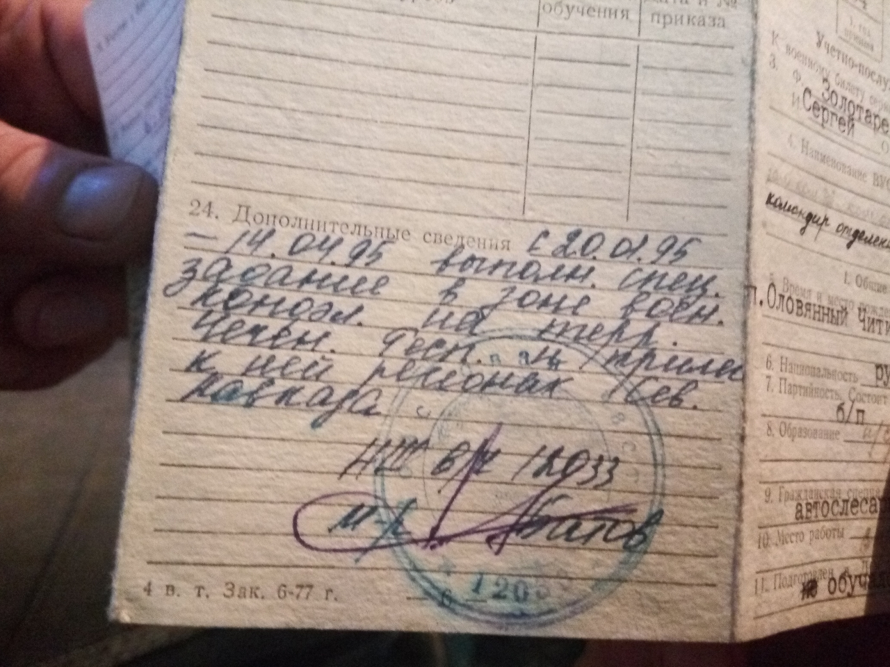 #601Здравствуйте,подскажите пожалуйста или дайте ссылку к какому источнику можно обратиться.Ситуация такая,мой друг учавствовал в специальных операциях на территории Чеченской республики в 1995г.Положены ли ему какие то выплаты или льготы.Ниже выложил записи в военном билете и УПК.