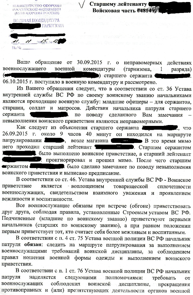 [ref]akim0204[/ref], Патрульный выполнял обязанности предусмотренные его уставом и предписанием на маршруте. Ответ вы от кого получили ? Правильно от коменданта, вот и дал Вам ответ в своём виденье, чтобы получить иной как Вам кажется ответ, основанный на ОВУ, надо обратится в военную прокуратуру. Далее сравнить два ответа и спор закончится!