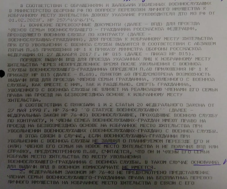 #1339Точно такая же история. Уволился 2010 году, по месту службы и проживания, получил квартиру. Через 13 лет решил переехать в другой регион. Личные вещи отправил транспортной компанией за свой счет. В ВК где приписался потребовали справку согласно п.68 ПМО №815 от 2017 года, которую я не получал. В личном деле имеется запись, что сведений об использовании воинских перевозочных документов на перевозку личных вещей не имеется.