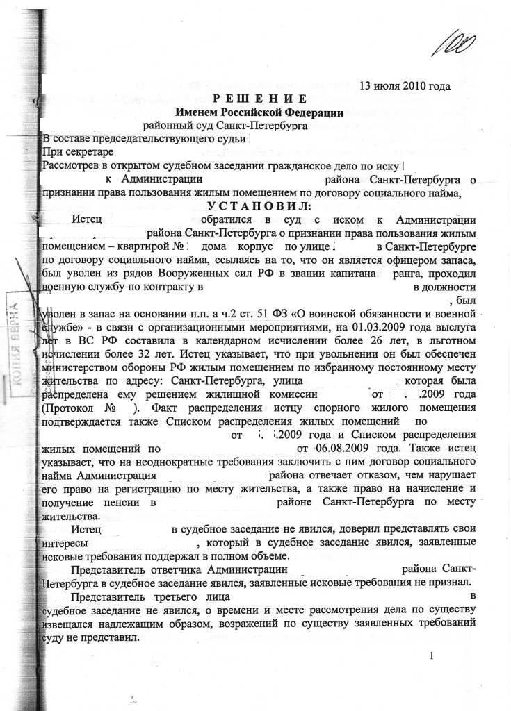 #13Извините конечно благородно... прочитал всю ветку практики "увольнение без жилья" ПРО МУНИЦИПАЛЬНОЕ СЛУЖЕБНОЕ ЖИЛЬЁ - НЕ СЛВА!!! Там речь в основном по ЗАТО и ЗВГ....Будут, если Питер. У них (Администраций и Жилкомитета) позиция, вода камень точит. Потом еще следующий этап - заставить заключить договор соцнайма, даже при наличии судебного решения.Сейчас ждем - будут ли обжаловать...