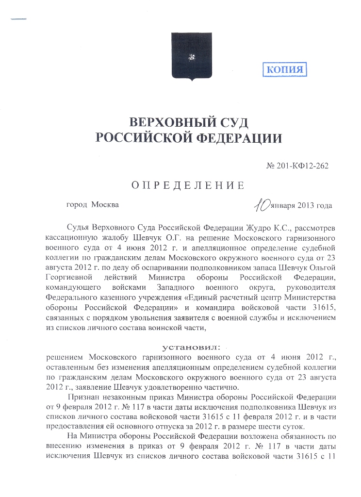 #142Может в этой теме кто ответит. Братья окажите помощь в написании заявления в суд. Ситуация такая: Уволен приказом МО 10 декабря 2012г. Исключен из списков части приказом МО от 20 декабря с 31 декабря 2012г. Жильем обеспечен. Положенное ДД получено за ноябрь и декабрь в декабре. Оклады перечислили 29 декабря, вешевое имущество в натуре получил в декабре. В приказе МО на исключение стоит сумма ДК за вещ.имущ. за 2012 год, МО приказал ее выплатить но этой суммы на счет до сих пор не поступило. Операторы ЕРЦ в один голос твердят ожидайте в ближайшее время, хотя эта сумма в расчетном листе за декабрь отражена как перечисленная в банк 29 декабря 2012г. и есть даже номер платежки. Каковы мои шансы перенести дату исключения на дату поступления ДК за ВИ и соответственно получить ДД за это время. А так-же истребовать отпуск за 2013 год с оплачиваемым проездом. Да еще забыл был в отпуске по 25 декабря с выездом самолетом, документы на компенсацию проезда сданы в часть 25 декабря но денег то-же нет. Киньте если возможно образец искового заявления.
