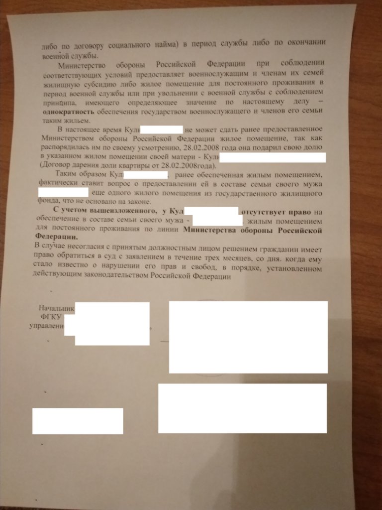 Добрый день, подскажите как действовать в ситуации. Жену сняли с учета на субсидию, по причине обеспечения. В 2008 году она подарила половину квартиры матери. Квартира была получена от КЭЧ на отца в 1987 или около того (34 метра). Отец в приватизации в 2005 году не участвовал, давно в разводе с тещей. Или проще пытаться подавать в суд, по нехватке метража на члена семьи.