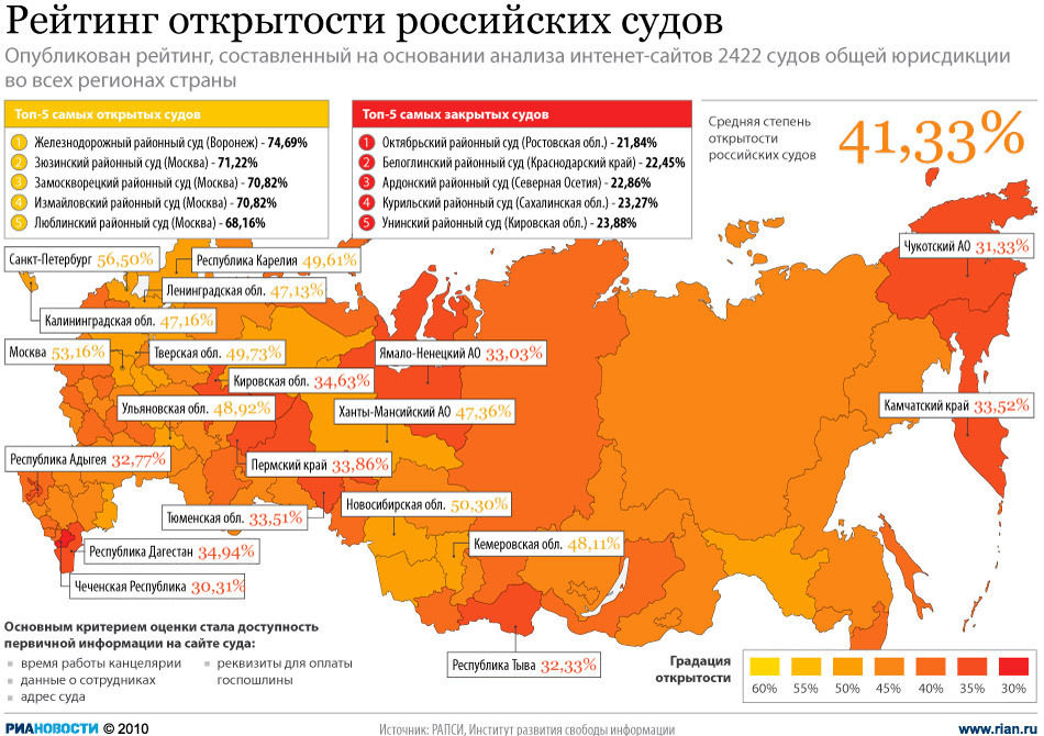 Степень открытости судов Российской Федерации, которым федеральным законом предписывается качественно изменить свою информационную политику, месяц спустя после его принятия составляет чуть более 41% согласно исследованию, подготовленному Институтом развития свободы информации (ИРСИ) и впервые публикуемому Российским агентством правовой и судебной информации (РАПСИ).