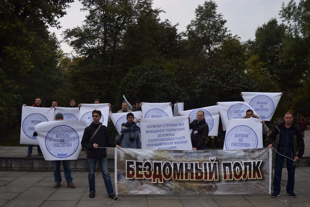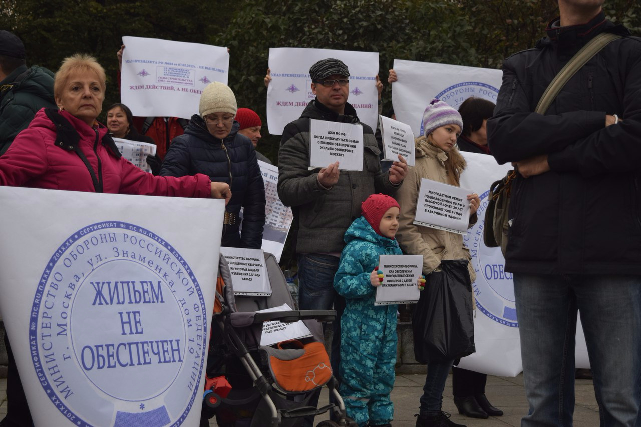 Показать текстВ субботу, 17 октября, возле здания министерства обороны России прошел пикет, организованный активистами из числа некоторых военных, которые должны получить в собственность новое жилье в Москве. Основная претензия пикетчиков — несоблюдение сроков передачи домов из собственности Минобороны в собственность государства, из-за чего оформление прав на готовые квартиры 1600 военнослужащих и их семей якобы было сорвано.