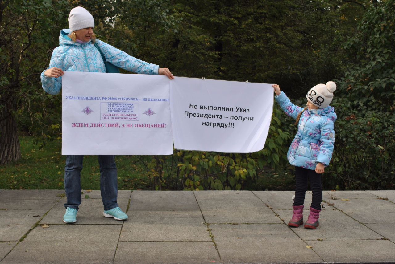 В ходе проведения пикета было составлено обращение к Президенту РФ Путину Владимиру Владимировичу. В обращении участники пикета выразили свою озабоченность текущей ситуацией, в частности недовольство генподрядчиком строительства жилья в городе Москве АО «Оборонстрой». Указанный генподрядчик является виновником переносов окончания строительства и заселения. Перенос окончания строительства и заселения происходит периодически с конца 2013 года. Причины переноса постоянно изменяются.