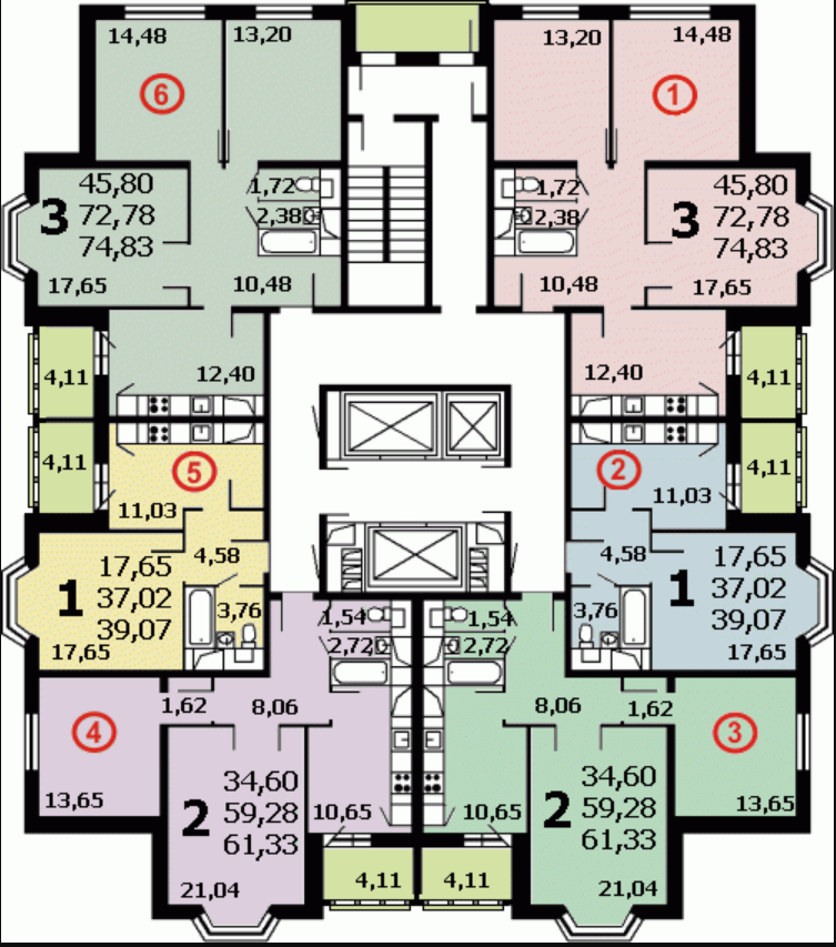 144 квартиры, 25 этажей (1 этаж не жилой), планировка одного этажа (на некоторых этажах нет балконов):