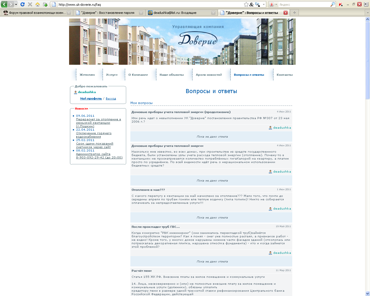 Итак, УК ООО "Доверие" пишет, цитата:"К нашему растройству рады Вам сообщить, что мы не смогли расчитаться с подрядными организациями и естественными помонолистами и с 22 июня 2012 года нас признали банкротами согласно арбитражного дела № А56-31905/2012."