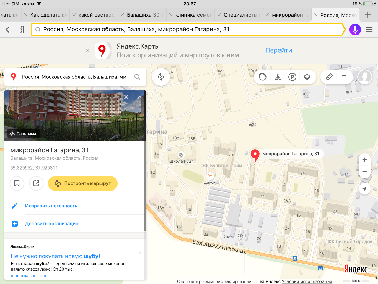 #8841соседняя ветка г. Балашиха мкр. ГагаринаЭто рядом с теми домами на фото выше. Строительный адрес владение 4. На картах Гугл отображается как 23 дом а на яндекс картах как 31.