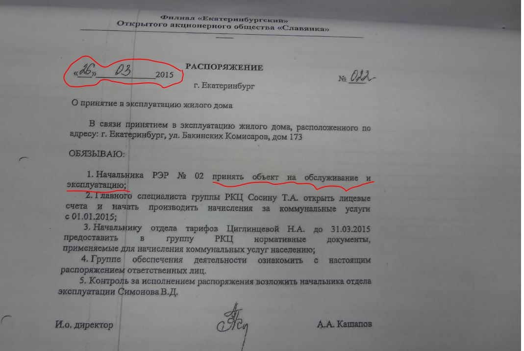 Введен в эксплуатацию наш дом был только в марте 2015г. (см. распоряжение директора Филиала "Екатеринбургский" ОАО "Славянка" от 26.03.2015г. №022, представленное мной выше).
