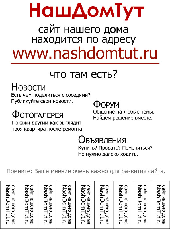Вам понравилось, но мало соседей, которые знают о нашем сайте? Распечатайте объявление и повесьте его на доске объявлений подъезда. Неравнодушные соседи подключатся к общению. Обновляйте и дополняйте информацию, которая полезна лично Вам. Клочки бумаги и потрепанные записные книжки сослужили добрую службу, но в них очень просто запутаться.