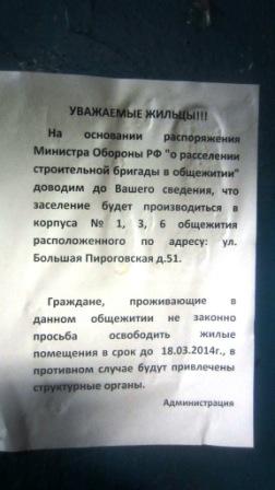 Расселение военного общежития на Пироговке