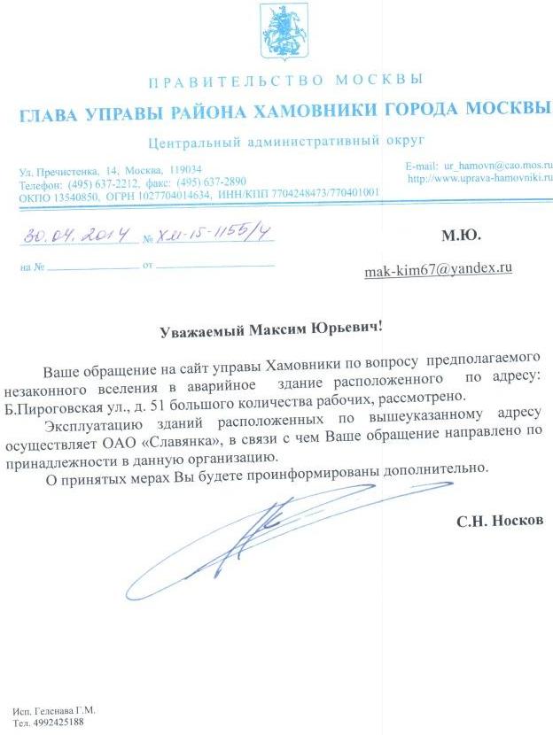 , то может есть смысл и им отписаться. А в управу и вовсе - по "электронке"Управа района Хамовники и Хамовническое РОВД против.