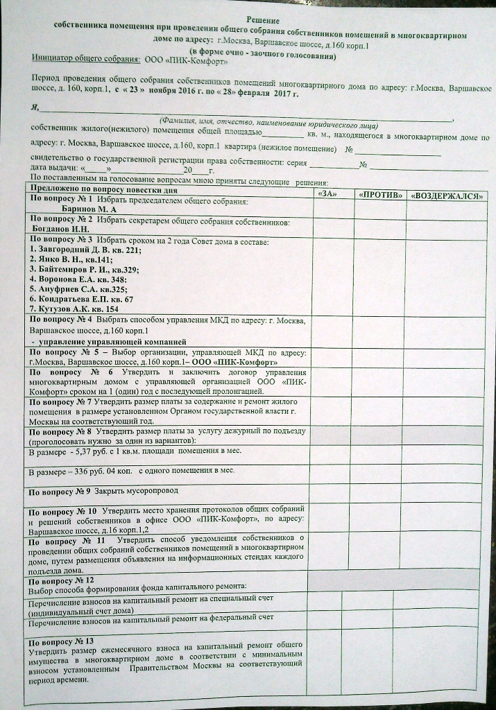 К тем, кто хочет сменить управляющую домом организацию, у нас одна просьба: отдайте свои заполненные бланки для голосования не «Волонтерам» (работающим на ПИК-Комфорт совсем не бесплатно), а старшим своих подъездов – с дальнейшей передачей консьержам. В таком случае можно взять под контроль правильность подсчета голосов компанией ПИК-Комфорт.