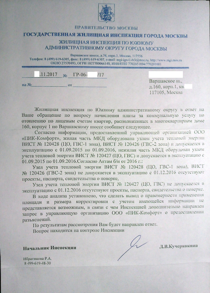 #987Мосжилинспекция вынесла штраф управляющей организации ООО "ПИК-Комфорт" за неисправный узел учета тепловой энергии по отоплению в МКД по адресу: г. Москва, Варшавское шоссе, д. 160, корп. 1