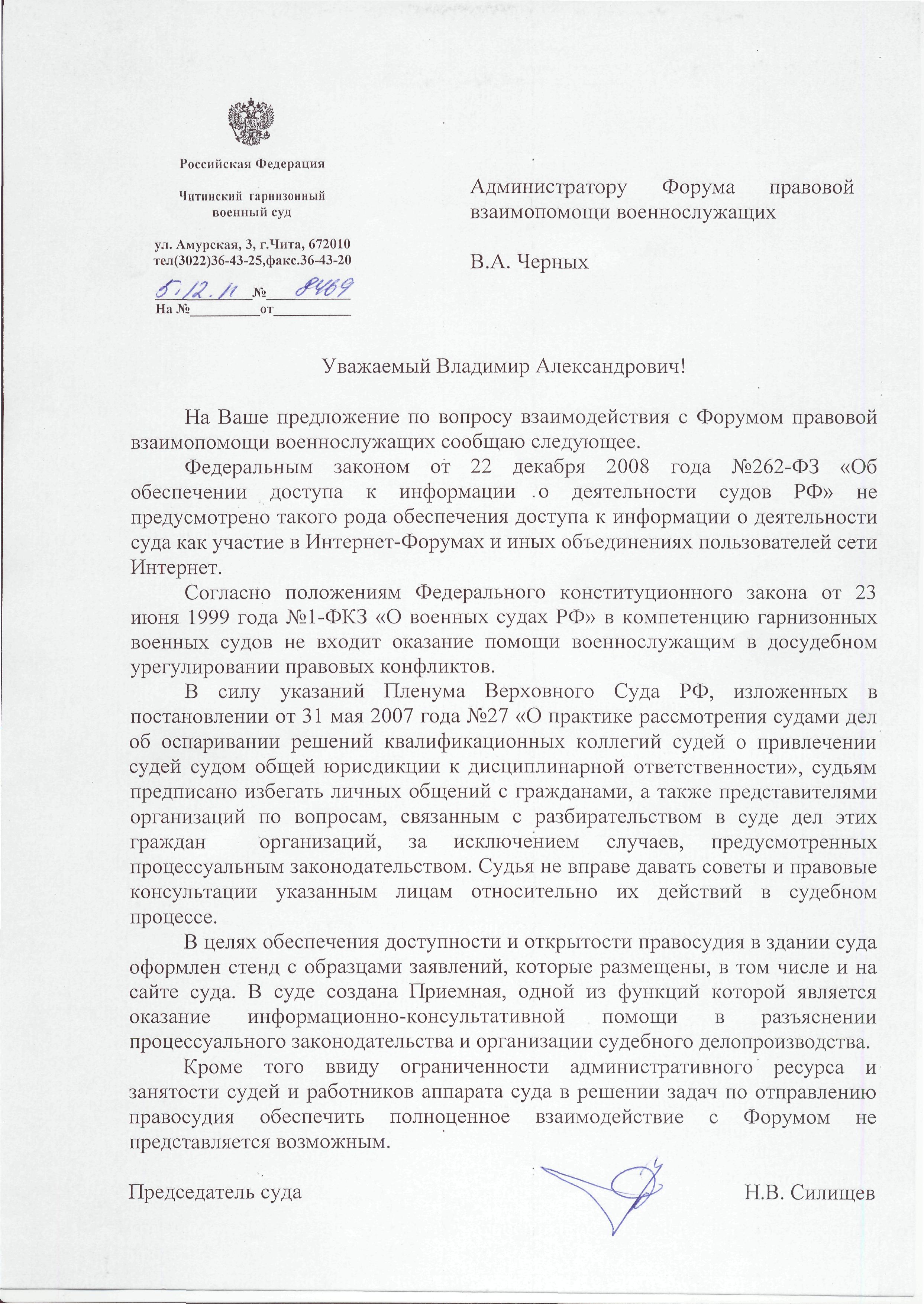 военного суда на Ваше обращение от 16 ноября 2011.