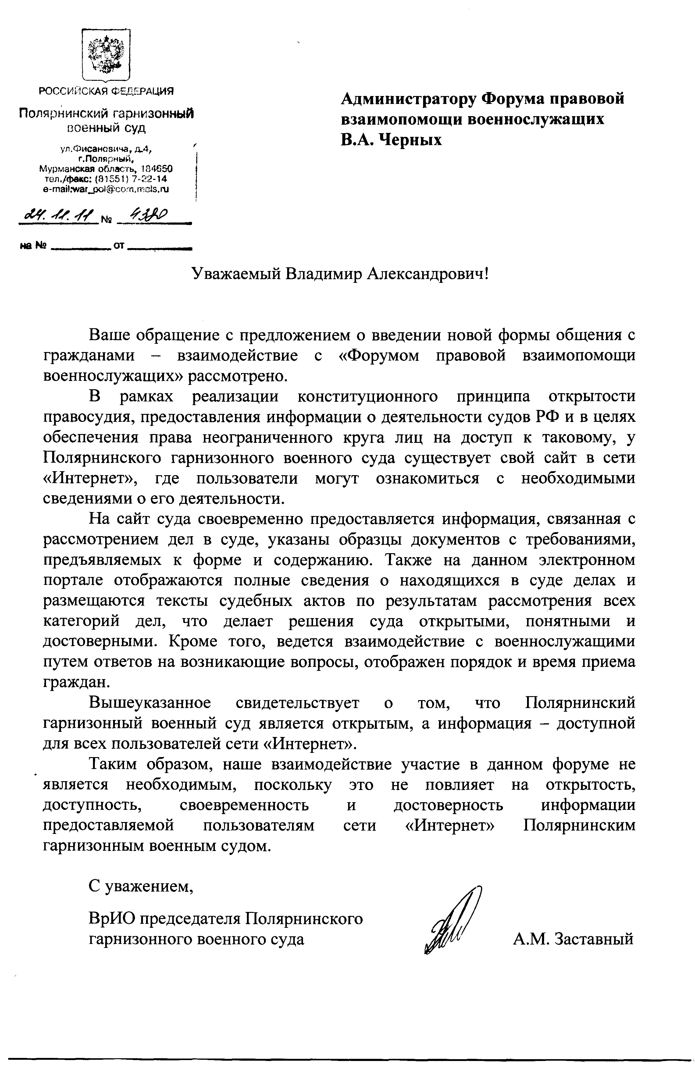 Интересно, а Саратовский гарнизонный военный суд что-либо на Ваше предложение о сотрудничестве ответил? Что-то я не нашёл упоминания о нём на этой веточке?