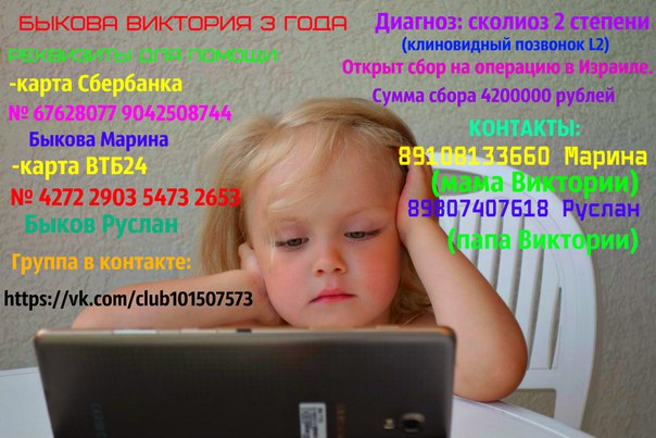 Все кто желает оказать какую-либо нам помощь, в целях избежания мошенничества, заходите, пожалуйста, на наши страницы в одноклассниках Быкова Руслана Александровича http://ok.ru/ramzes.www или Быковой (Викуловой) Марины Александровны http://ok.ru/profile/464065104598. Кроме того, информация размещена но военном форуме военнослужащих Военсуд.ru по согласованию с Администрацией форума Помогите ребенку. Также информация размещена на сайте В контакте, по согласованию с Администрацией открыта группа В помощь Виктории Быковой http://vk.com/club101507573. Дополнительно информация размещена волонтерами на сайте ВabyВlog.ru http://www.babyblog.ru/community/post/blago/3152045. Везде прилагается медицинская документация и сведения о Виктории. Все материалы и фотографии Виктории промаркерованы Администрацией сайта В Контакте.