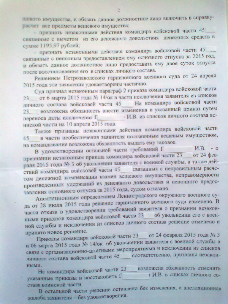 #19Такая интересная апелляция. За военнослужащего был написан поддельный рапорт на увольнение, причём от женского рода. Я согласна на увольнение. В суде указанный факт всплыл. Проблема, как я описывал на ветке исключение из списков части в том, что военнослужащий в суде обязан говорить, что он желает проходить военную службу, а не то что он не обеспечен жильём по избранному месту жительства.