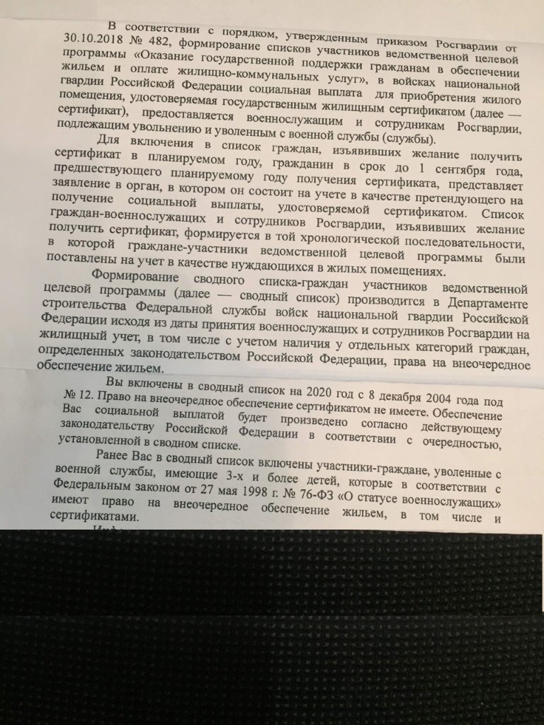 #6574Здравствуйте форумчане! Нужна Ваша помощь. Я -пенсионер Росгвардии, состою на очереди на сертификат (встала до 2005 года еще в МВД), в своем регионе была на очереди 2-ой, льгот нет, в 2018 году Росгвардия сформировала общую очередь из военнослужащих и бывших сотрудников по всей России и я стала уже под № 12. на мой запрос о сроках реализации моего права. мне ответили, что впереди стоят военнослужащие, имеющие 3 и более детей, т.е. внеочередники. В разговоре со специалистом Департамента Росгвардии мне сказали, что хоть они и позже меня встали, но они внеочередники.Подскажите как должны распределятся сертификаты, должно ли быть 2 очереди и как выдаются сертификаты очередникам не имеющим льготы. Может кто нибудь посоветует, что делать, а то я думаю что не известно сколько ждать, меня будут каждый год отодвигать и отодвигать. За ранее спасибо.