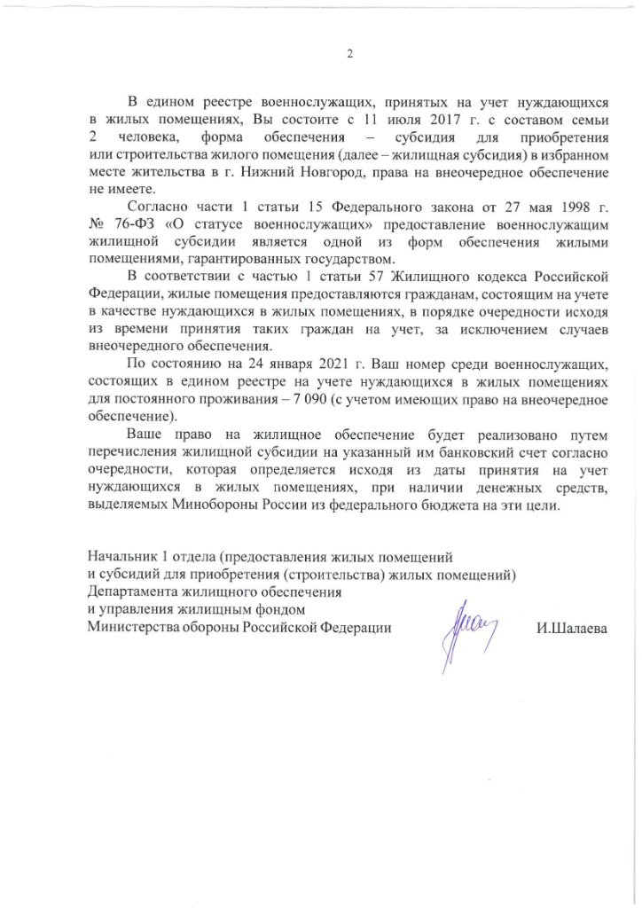 Добрый день! Я военный пенсионер, признан нуждающимся с июля 2017 года. Запросы в Департамент финансового планирования, департамент финансового обеспечения и департамент жилищного обеспечения отправил 10 января 2022 года после посещения вашего форума. Ответ получил 27 января. Ответ офигенный. Буду писать ещё раз уже в другой форме. Так мне и не ответили когда и в каком году обеспечат. Прикрепляю ответ из МО РФ. Разослал всем своим знакомым очередникам, чтобы не было иллюзий. Я за любой кипишь, готов писать куда угодно, терять уже нечего.