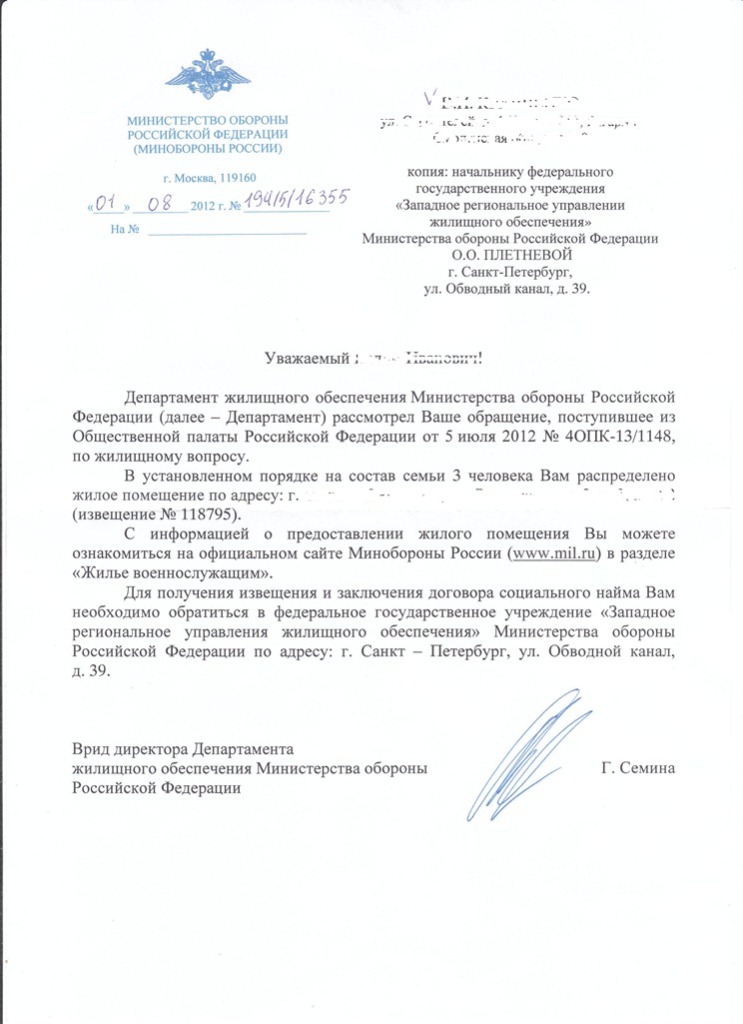 Re: Горячая линия Общественной Палаты по военному жилью
