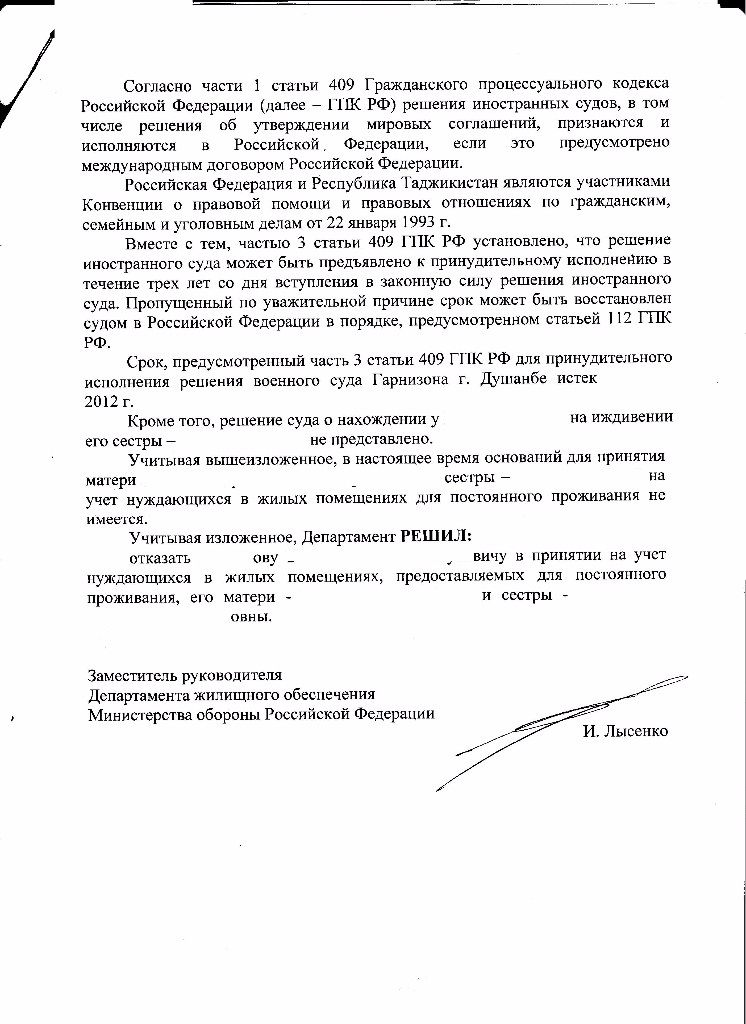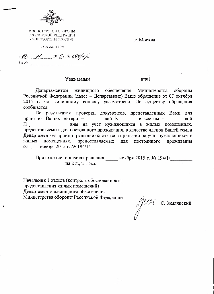 Сегодня получил ответ на мое обращение.Ранее писал:http://voensud.ru/post1233411.html#p1233411.Отказали в постановке на учет мать.Сестру не просил ставить на учет(она не является ЧС), хоть и проживаем совместно более 5 лет.Просил лишь учесть при определении имеющегося в собственности ЖП.