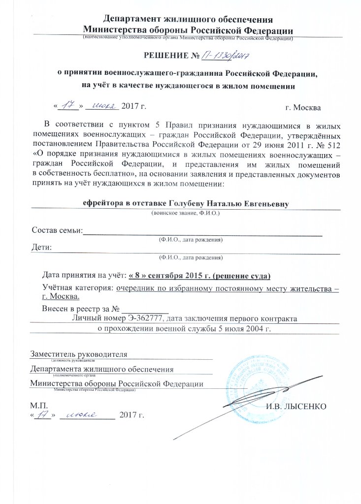 #3020юридически ничтожное решение вынесенное неуполномоченным должностным лицом м положенное в обоснование именем РФ. В календаре еще ориентируетесь?QR_BBPOST А к тому же формально Ваша жена на дату увольнения не была признана нуждающейся. Было решение с отказом.