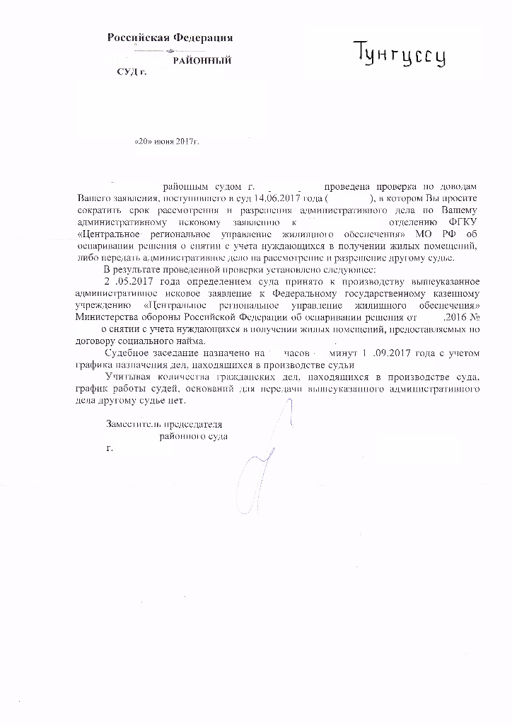 Ситуация следующая: 22 мая 2017 года обратился в районный суд с АИЗ об отмене решения ТРУЖО о снятии с ЖУ в получении ЖП по ДСН. На днях по почте получил определение судьи о принятии АИЗ и возбуждение производства по АД со следующей формулировкой в конце определения: "После проведения данных процессуальных действий, считать подготовку административного дела к судебному разбирательству оконченной, назначив административное дело к судебному разбирательству в ... час. ... мин. 11 сентября 2017 года..."
