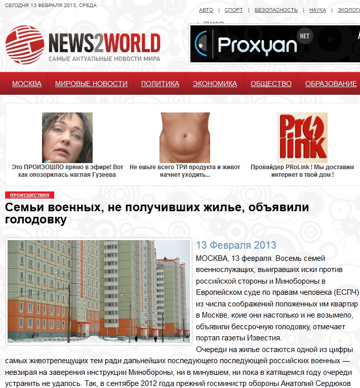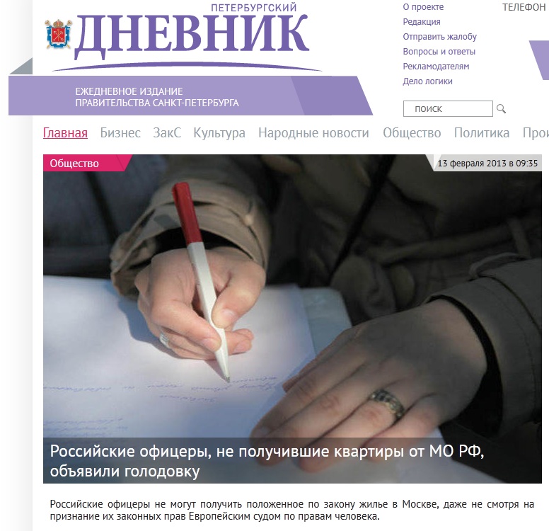 13 февраля Наталья Золикова, жена офицера в отставке Константина Маркина, мать четверых детей, объявила бессрочную голодовку. Женщина пытается добиться от Минобороны положенную по закону квартиру в Москве. Новгородские власти о демарше Натальи Золиковой в курсе, однако, помочь ей не могут.