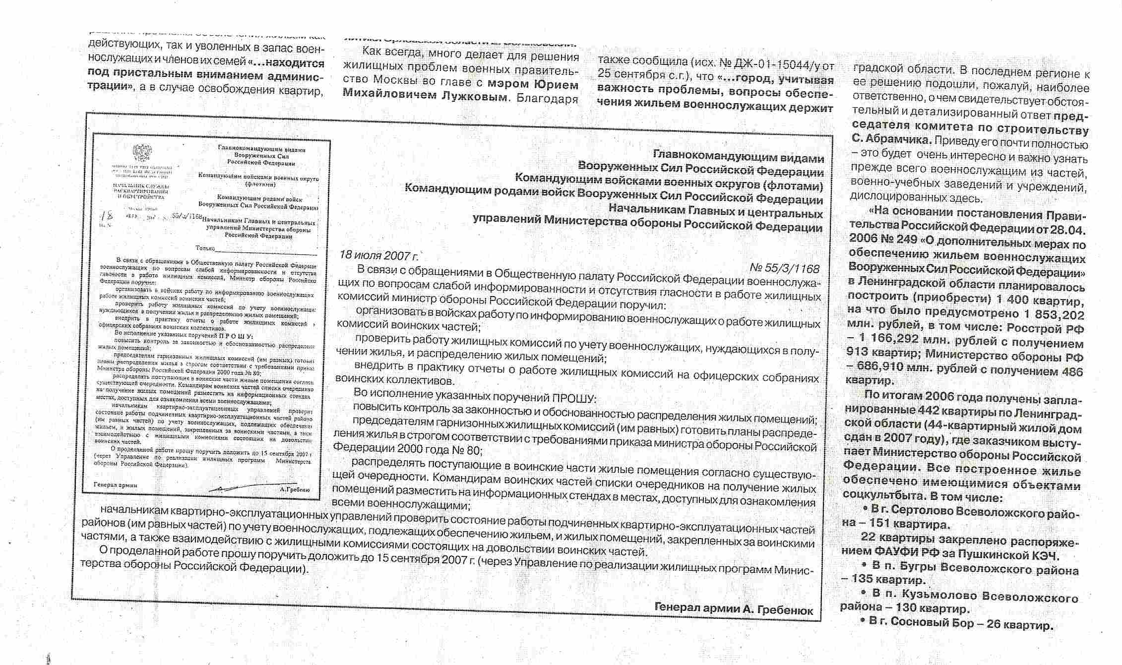 Спасибо Олег! Если честно, правовых аргументов совсем не достаточно, точнее, законодательно их нет, на мой взгляд, даже проштудировав полномочия жилкомиссий, по аналогии-гарнизонных,например. Товарищу просто тупо для начала отказывают даже в предоставлении телеграммы о выделении жилья в часть (потеряли, да и была ли???) и в письменном виде мотивированного отказа в утверждении списка, в общем квартирка ушла "нужному" человечку...