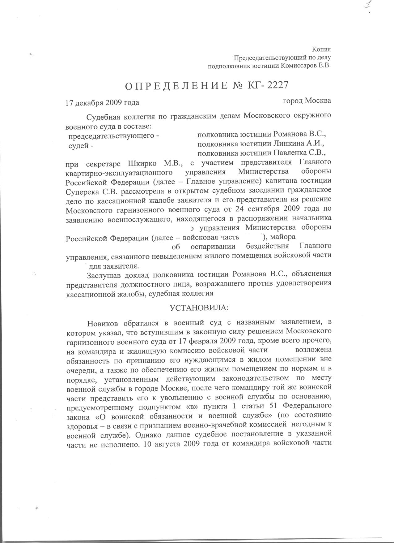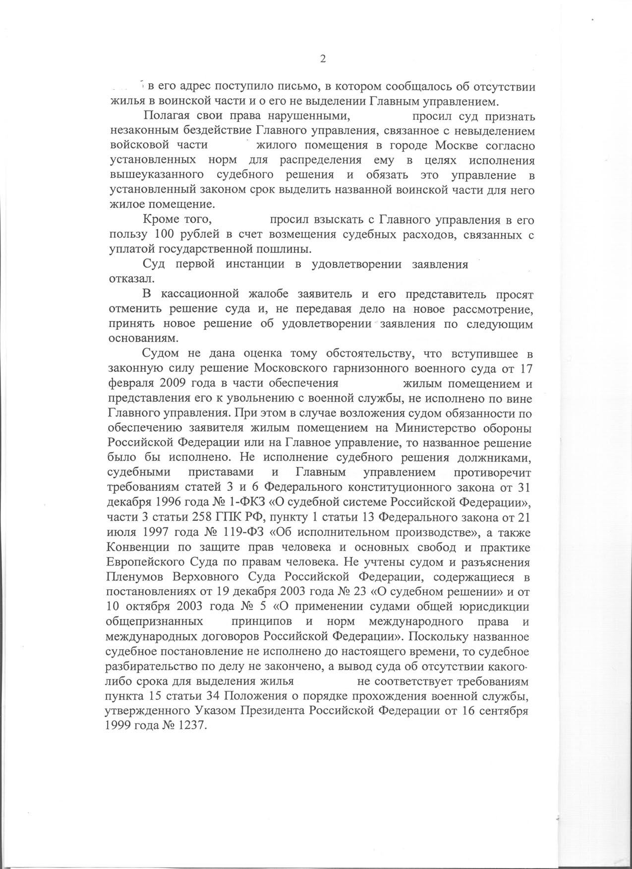 Согласен с Вами, не останавливайтесь, ищите другой подходящий путь в решении жилищного вопроса и привлечения другого более "дееспособного" ответчика МО РФ во главе с его министром. Согласно контракта только оно и государство и никто больше гарантируют ибеспечение жильём и соблюдение прав.Кассация сегодня прошла - решение без изменение, кассация без удовлетворения(((