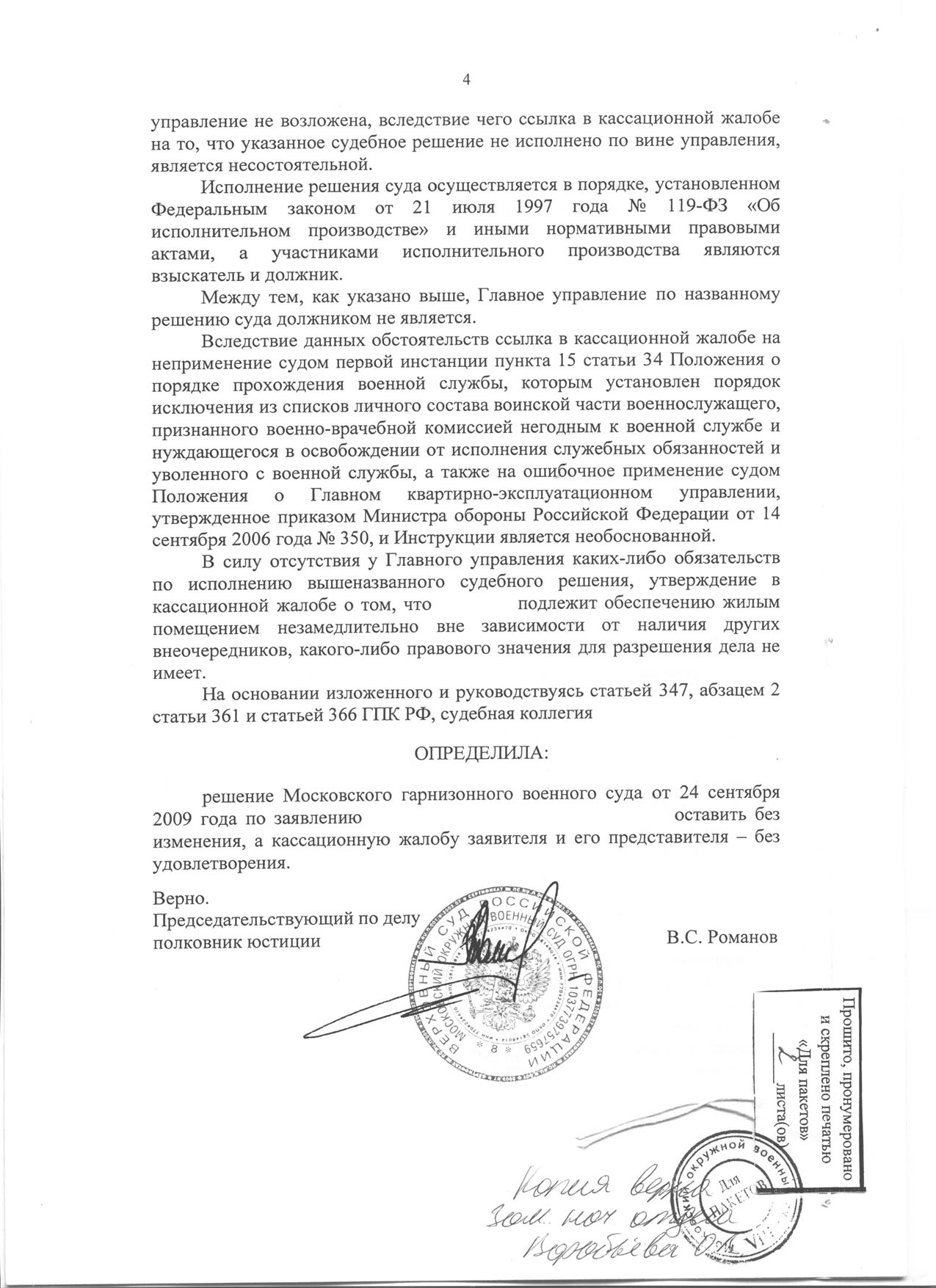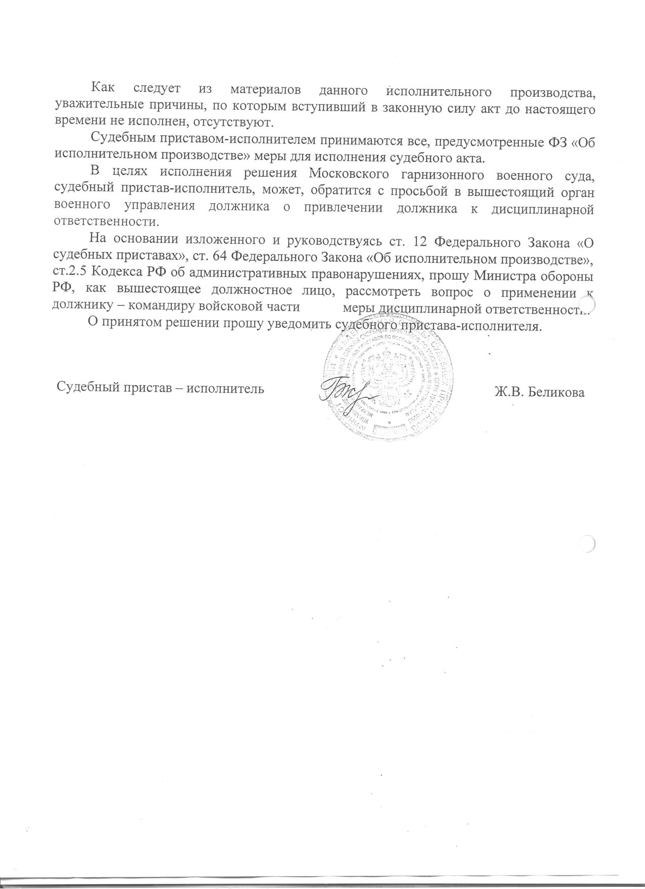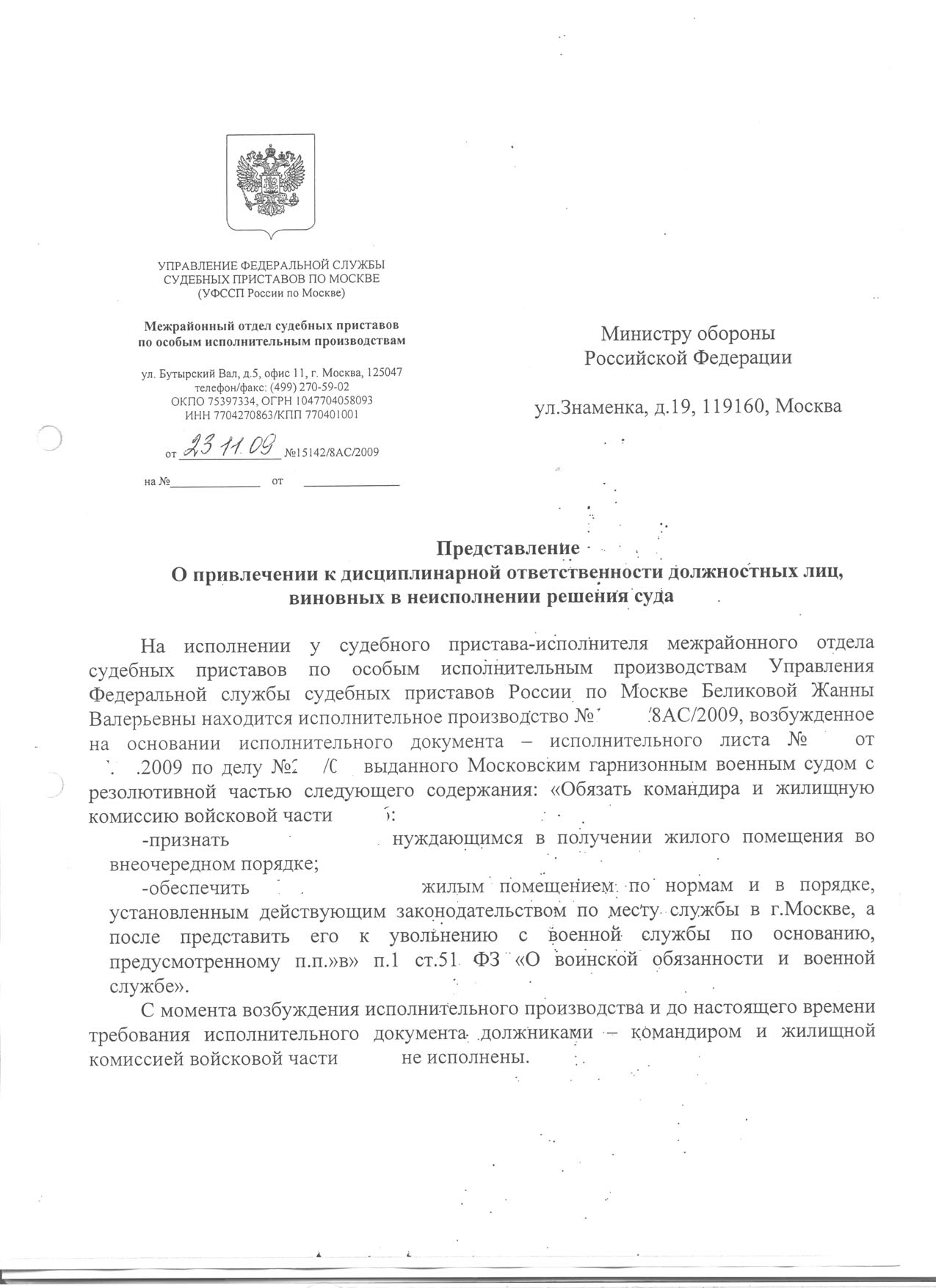4. На основании п.11 ч.3 ст.68 ФЗ «Об исполнительном производстве» установить запрет на утверждение должником – Министром обороны Российской Федерации планов распределения жилых помещений в Московском гарнизоне без учета моих интересов и необходимости исполнения решения Новороссийского гарнизонного военного суда от 22 апреля 2008 года (согласно прилагаемому исполнительному листу № 194-г/с от 7 июля 2008 года).