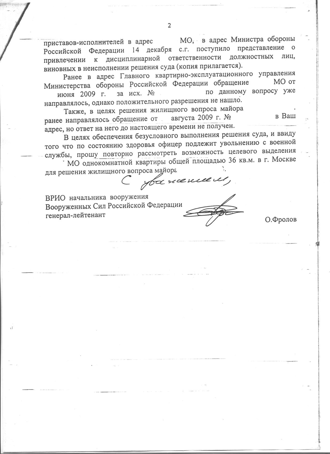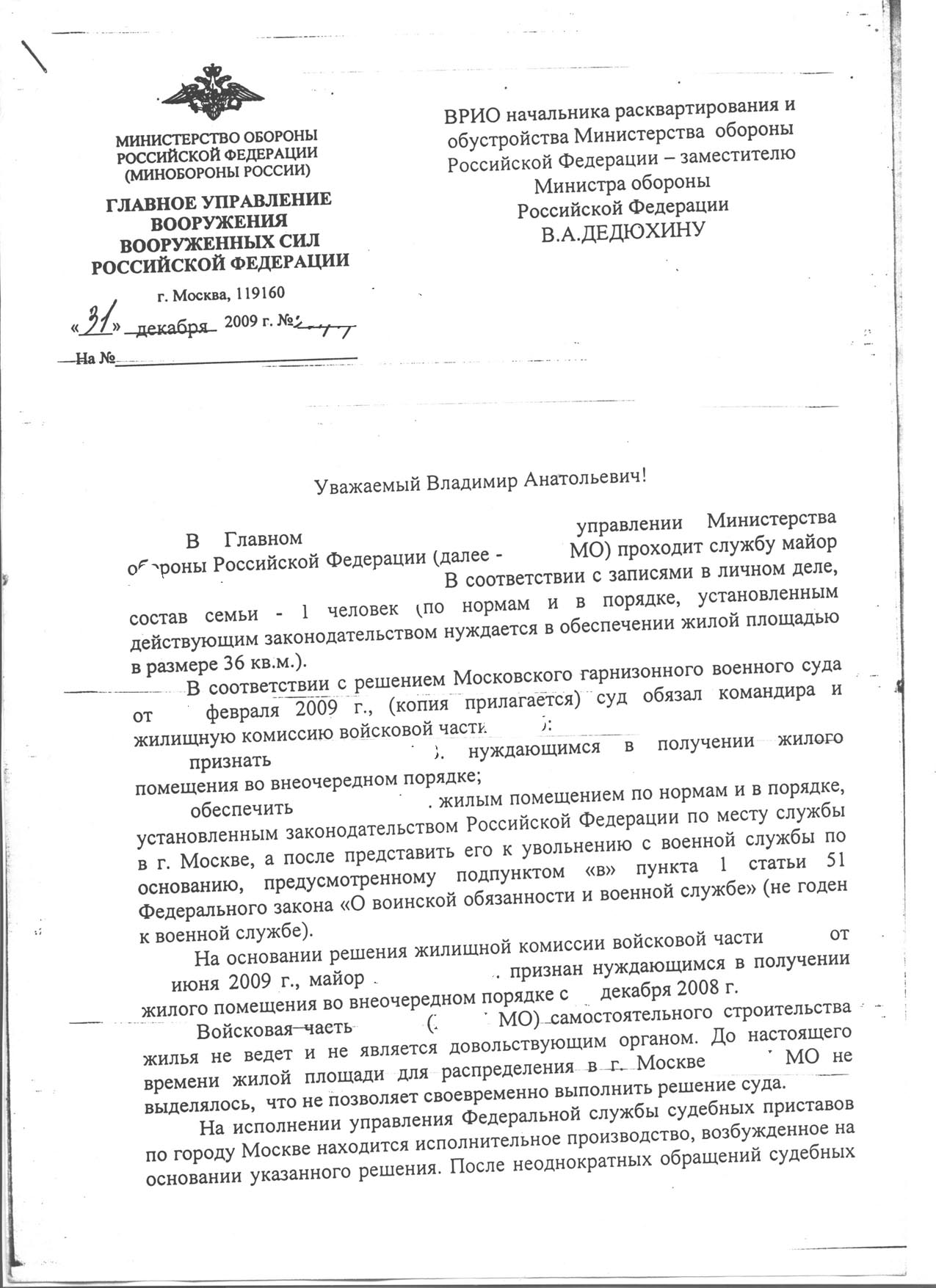 2. Обязать Министра обороны РФ и ГлавКЭУ внести изменения в ....и незамедлительно выделить войсковой части .... жилое помещение в г. Москве, согласно установленных норм, для распределения мне ...