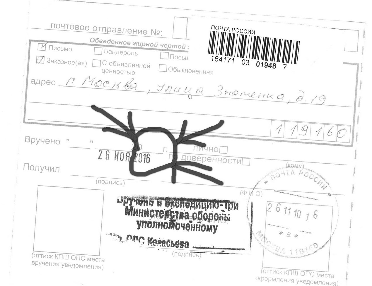 #228Это экспедиция именно МО, в уведомлении это указано. В частях тоже не командир сам письма получает. От этого у него ответственности за ответ не меньшеЧто волнение вызывает? Отметка обозначает, что ваше письмо получено. Перепроверять незачем. Поверьте, я таких уведомлений получил не одну и не другую сотню