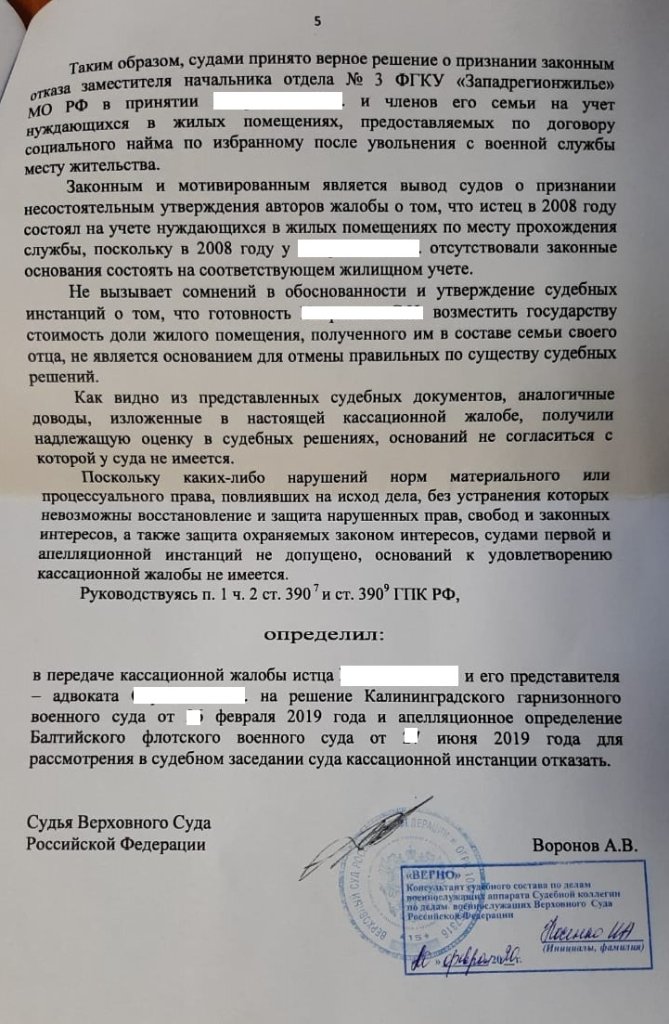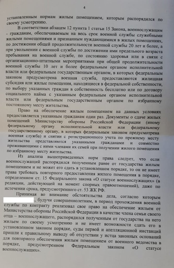 2. В феврале 2019 г. РУЖО передумало, и сняло Х. с учета нуждающихся. Ранее Х. уже получал жилье от Минобороны как член семьи другого военнослужащего – своего отца. РУЖО почитало, что государство свои обязательства перед Х. выполнило, а повторное жилье ему не положено.