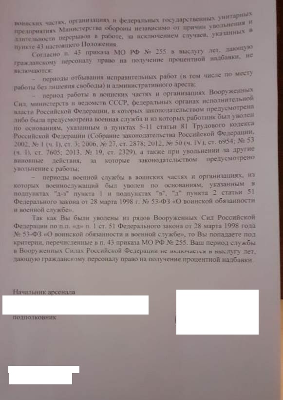 Вопрос следующего плана, одноклассник трудится ГП в в/ч, ранее служил в ВС РФ (выслуга около 10 лет). Уволен из ВС РФ по "плохой" статье. Сейчас возник вопрос о том, что надбавку за выслугу лет по ПМО № 255 ему выплачивалась в более высоком размере чем положено, т.к. при приёме на работу ему в выслугу засчитали весь период военной службы. В настоящее время КВЧ ему хочет вычесть из выслуги весь период военной службы и взыскать с него всю переплаченную сумму. Но в соответствии с п. 43 ПМО № 255 "В выслугу лет, дающую гражданскому персоналу право на получение процентной надбавки, не включаются: ...периоды военной службы в воинских частях и организациях, из которых военнослужащий был уволен по основаниям, указанным в подпунктах "д - з" пункта 1 и подпунктах "в", "д" пункта 2 статьи 51...". Т.е. на сколько я понимаю не засчитывается период военной службы в в/ч из которой он был уволен, т.е. по последнему месту службы, а не весь период военной службы? Имеется ли по данному вопросу судебная практика, разъяснения ВС, КС? КВЧ дал ответ на обращение однокласника по данному вопросу, где указал вышеуказанное менение. Готовим заяву в прокуратуру, а если не получится, то в АИЗ суд.