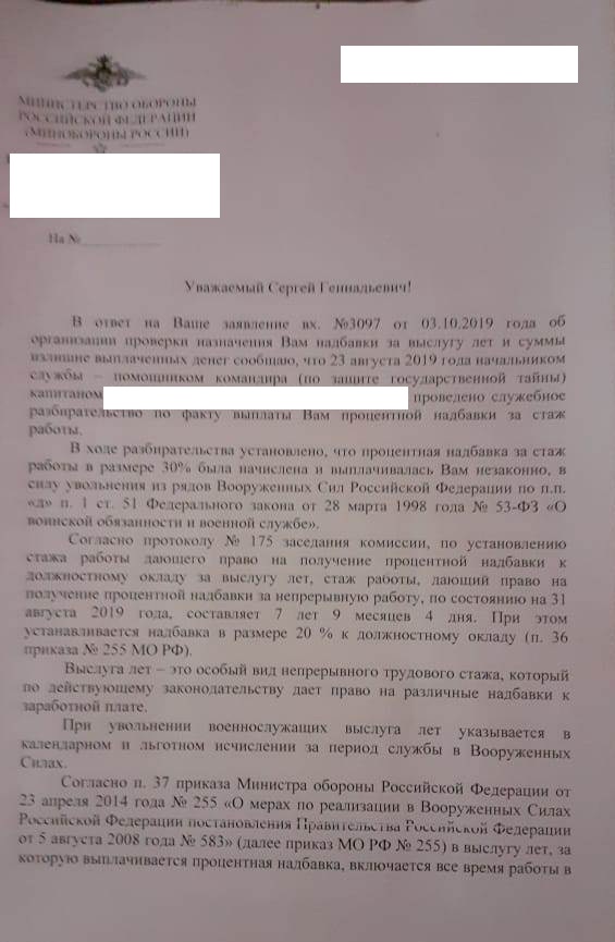 - прошу разъяснить порядок выплаты надбавки, служил там, там и там, переведен туда-сюда тогда то, уволен из в\ч такой то, тогда то и по такой то статье... считаю, что согласно... (приказ 255 п. ст.) из стажа дающего право на выплату надбавки должен быть исключен ТОЛЬКО период с ... по... .. . прошу дать мотивированный ответ по вышеуказанной ситуации...а еще приложение - Выписка (или копия) послужного, копия трудового договора, копия Протокола заседания комиссии по установлению надбавки за стаж (его необходимость оговорена в Приказе 255). и письменно в адрес Начальника УФО, такое же можно и в прокуратуру и на сайт МО ...