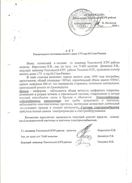 #5Выше написанное письмо было составлено от всех гражданских жителей городка. Многие из них уже судятся более года. Всем предлагали ГЖС с 2000 года, но в 2010 году программа закончилась, а сертификат так и не пришел. Во вложении несколько отписок от Мин. Обороны по поводу ГЖС и состояние домов.