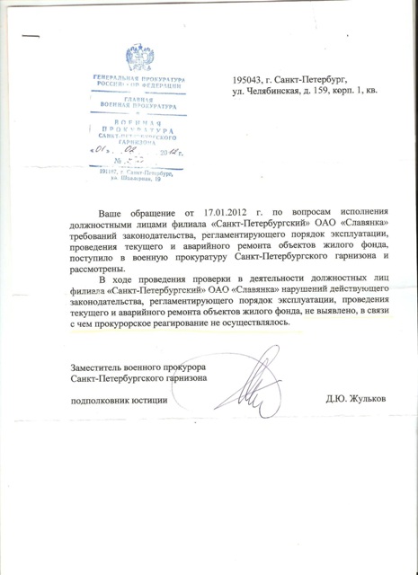 Это только так кажется. Именно на основании этих докуметах Вы можете не платить за жилищные услуги, которые Вам не предоставляются. Для решения этой проблемы далее, считаю, необходимым написать жалобу Министру обороны с приложением ответа Славянки и ГЖИ С-П подтверждающих факт не исполнения своих обязанностей должностными лицами ТУИО МО РФ. Не останавливайтесь на достигнутом, требуйте возбуждения административных дел со стороны ГЖИ в отношении правообладателя оперативного управления на жилой фонд и самоустранения его от выполнения своих обязанностей. Продолжайте долбить прокуратуру и администрацию и, дело сдвинется. Если остановитесь, то Ваши труды пропадут. Успехов и терпения.Но дело с мертвой точки толком и не сошло!