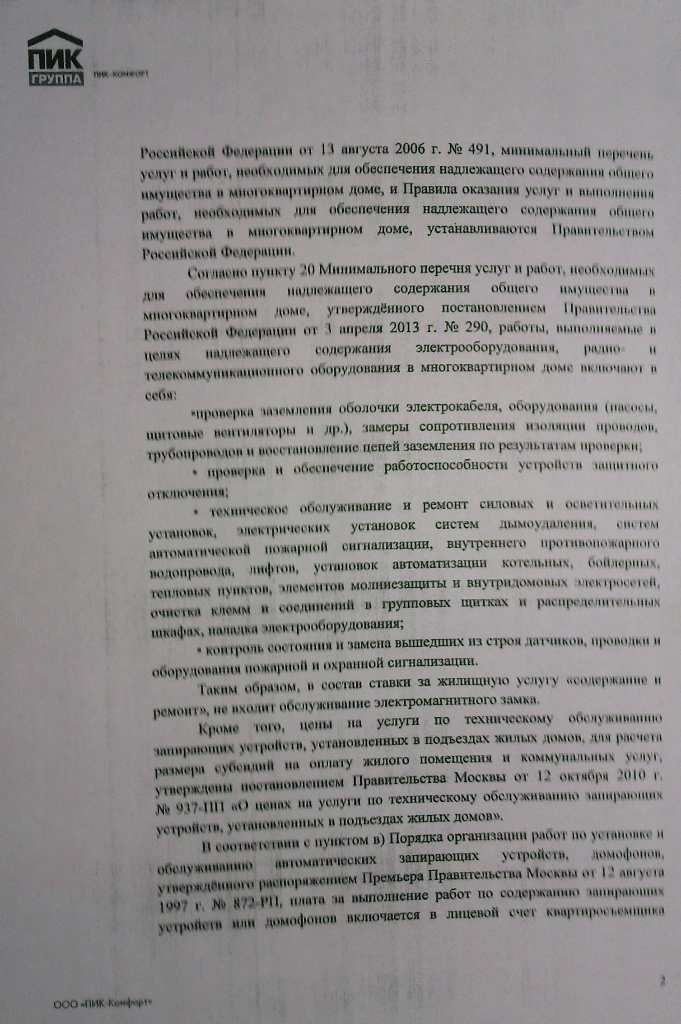 В соответствии с ч. 4 ст. 158 ЖК РФ размер платы за содержание и ремонт жилого помещения для собственников жилых помещений, которые не приняли решение об установлении размера платы за содержание и ремонт жилого помещения, в городе Москве устанавливается органом государственной власти города Москвы. Правительством Москвы цены за техническое обслуживание запирающих устройств (ТО ЗУ), обязательные для внесения собственниками жилых помещений не регулируются. В соответствии с п. 7 Приложения 4 к постановлению Правительства Москвы от 29.09.2009 г. № 1030-ПП «О регулировании цен (тарифов) в городе Москве» постановление Правительства Москвы от 12.10.2010 г. № 937-ПП определяет соответствующие цены только для расчета размера субсидий на оплату жилого помещения и коммунальных услуг (п. 1 постановления). Постановление определяет не сколько должен заплатить собственник, а сколько должны заплатить самому собственнику в виде субсидии, если таковая полагается. Таким образом, размер платы за ТО ЗУ актом города Москвы не установлен. Общих собраний собственников по данному вопросу не проводилось, по сути ПИК-Комфорт установил ставку за электромагнитный замок самостоятельно, без решения общего собрания собственников, что является грубым нарушением Законодательства.