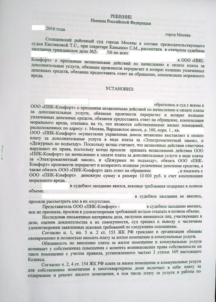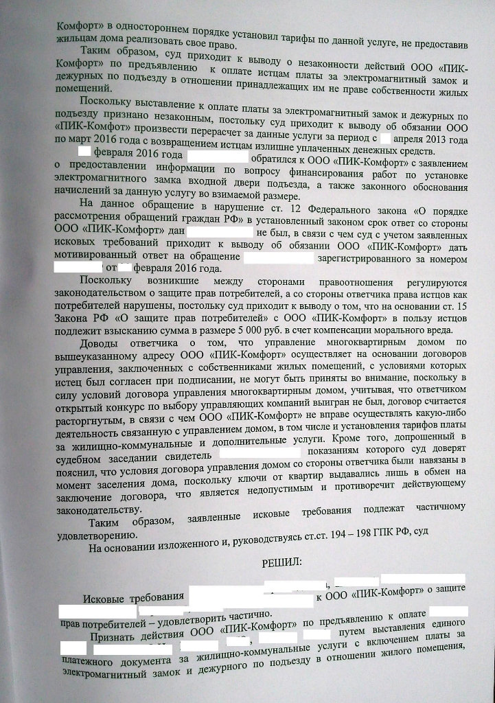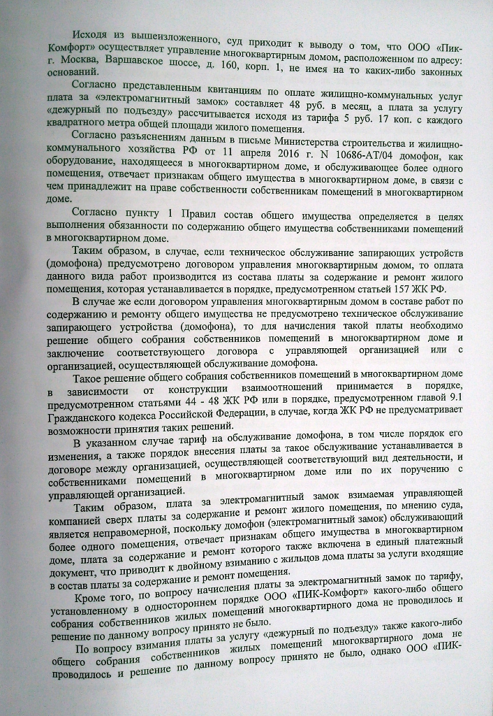 Обязать ООО "ПИК-Комфорт" произвести перерасчет платы за жилищно-коммунальные услуги за период с ... по ... (три года, мое примечание) с учетом исключения из платежных документов платы взимаемой за электромагнитный замок в отношении жилого помещения, расположенного по адресу..., и возвратить в пользу Ф.И.О..., излишне уплаченные денежные средства за электромагнитный замок