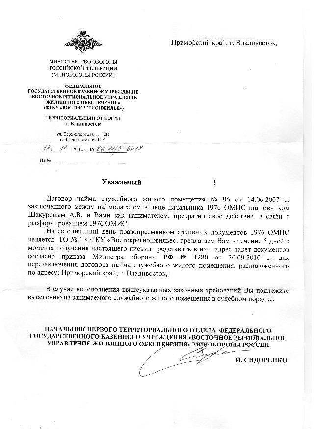 06.12.14 г. мной получено письмо от начальника территориального отдела № 1 ФГКУ «Востокрегионжилье» МО РФ № 06-11/5-6917 от 18.11.14 г. В письме Сидоренко И.Ю. угрожает мне выселением на улицу в случае невыполнения его требований по заключению с ним договора найма служебного жилого помещения.