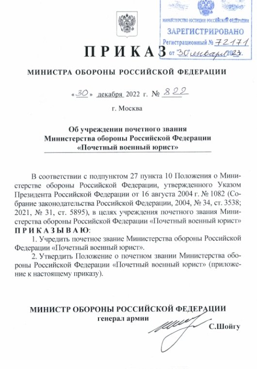 "Об учреждении почетного звания Министерства обороны Российской Федерации "Почетный военный юрист"