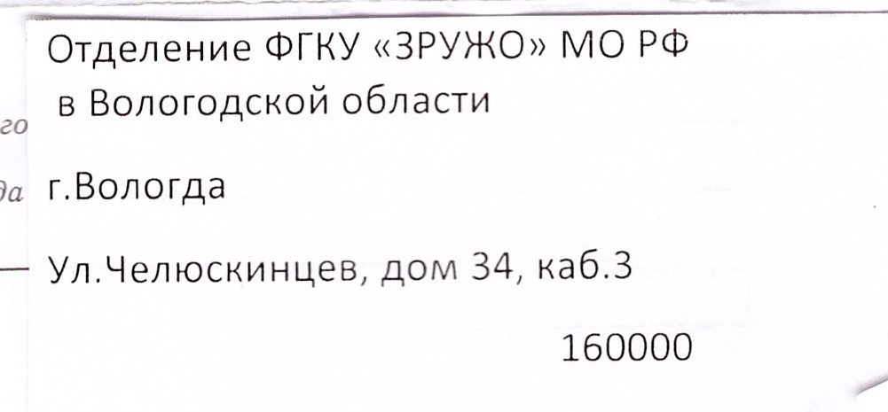 В соответствием с Приказом Министра обороны РФ № 1441 от 06.06.2012 установлен юридический и почтовый адрес Отделения,находящегося на территории Вологодского военкомата: г. Вологда,ул. Челюскинцев, 34.Вся почтовая корреспонденция направляется ТОЛЬКО по ЭТОМУ адресу.Никаких других адресов для получения корреспонденции НЕТ.В Вологодском военкомате Вашу корреспонденцию принимает секретарь и только потом она попадает к нам.Ни у кого из работников Отделения в должностных инструкциях (и в Положении Отделения) нет полномочий и указаний получать Ваши письма в других Отделения связи.Возможно при вводе единицы секретаря данная ситуация измениться.