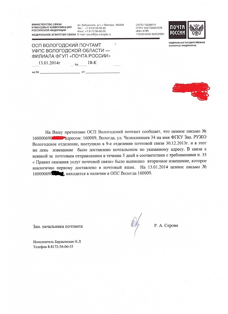 Уважаемый sausage,160000 г. Вологда ул. Челюскинцев 34 к 3 ФГКУ ЗАп. РУЖО Вологодское отделение Ившуковой О.В.