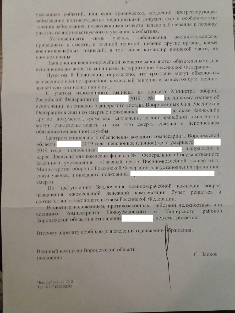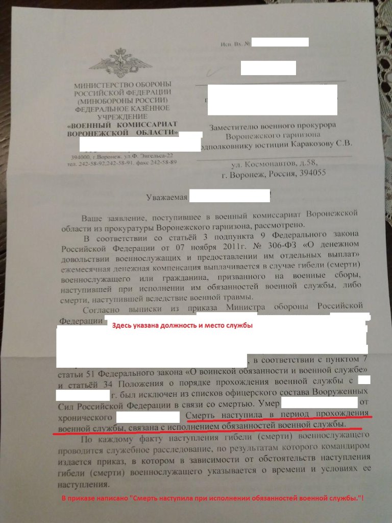 #854Во вложении ответ военного комиссариата за подписью облвоенкома. Из краткого содержания, приказ министра обороны для них не приказ и то что там написано их не интересует. А так же военком позволил себе солгать в ответе, а именно написал что, якобы в приказе министра обороны присутствует формулировка "Смерть наступила в период прохождения военной службы, связана с исполнением обязанностей военной службы".