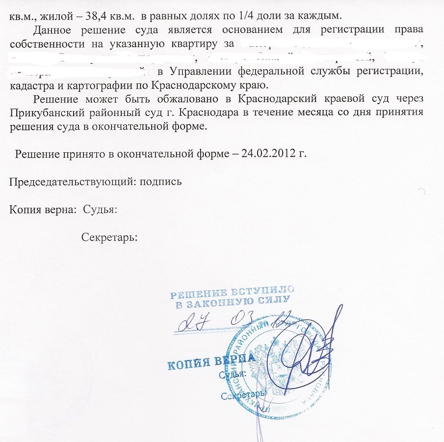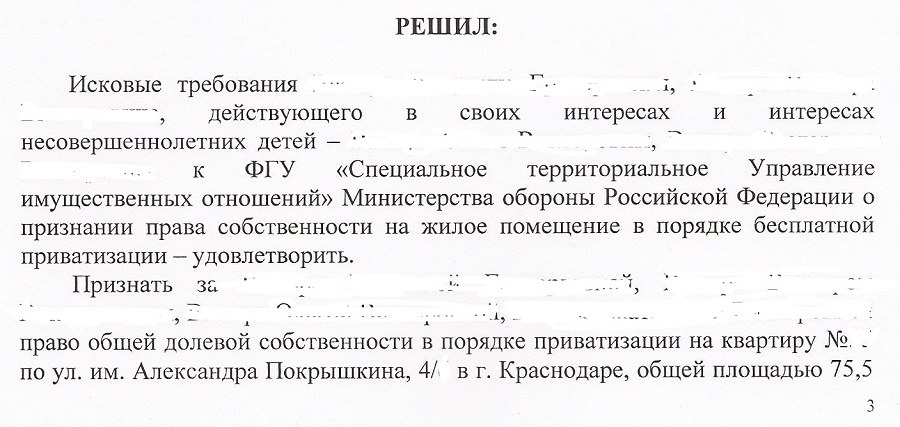 1. Признать за мной и членами моей семьи право собственности, в порядке приватизации, на выделенное нам жилое помещение (квартиру), общей площадью -ХХХ кв. метров, в том числе жилой площади - ХХХ кв. метров, расположенное по адресу: 350005, Краснодарский край, г. Краснодар, ул. им. Александра Покрышкина, д. 4/Х, кв. ХХ в равных долях на каждого, а именно: