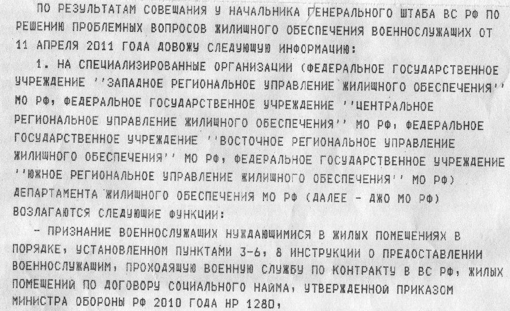 2. На вопрос по справкам ЕГПР, она ответила, что сейчас на утверждении документ, по которому выписки ЕГПР не нужны, а все будут писать на имя командиров своих частей рапорта об отсутствии в их собственности жилья. Если потом, в ходе проверок, выясниться, что кто-то обнанул, то все будет решаться в судебном порядке.