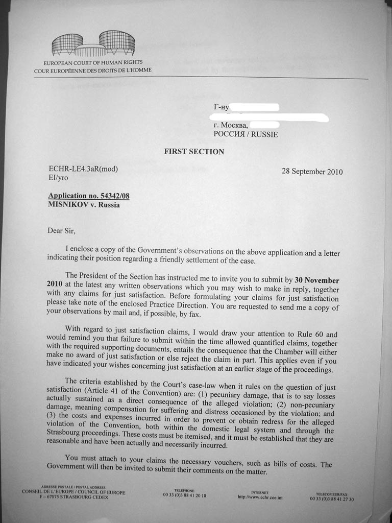 в ЕСПЧ подавал в августе 2009 года... Сопровод не мой, данный документ до моего почтового отделения не дошел))) ждемс полной версии, а пока добрые люди помогли, дабы срок не пропустить для представления возражений на этот бред))) "я оказывается препятствия сам создаю в исполнении суд.решения..."Прошло три года от момента подачи жалобы?